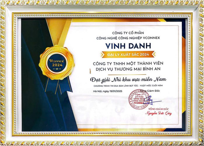 Ngày 19/01/2025, tại Hà Nội, Công ty TNHH Một thành viên Dịch vụ – Thương mại Bình An chính thức được Công ty cổ phần Công nghệ Công nghiệp Vconnex vinh danh là ĐẠI LÝ XUẤT SẮC NĂM 2024, với thành tích giải Nhì khu vực miền Nam.