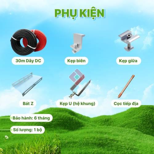 | 4 | Phụ kiện: 30mDây DC Bát Z, kẹp biên, kẹp giữa (hệ áp mái) Kẹp U (hệ khung) |