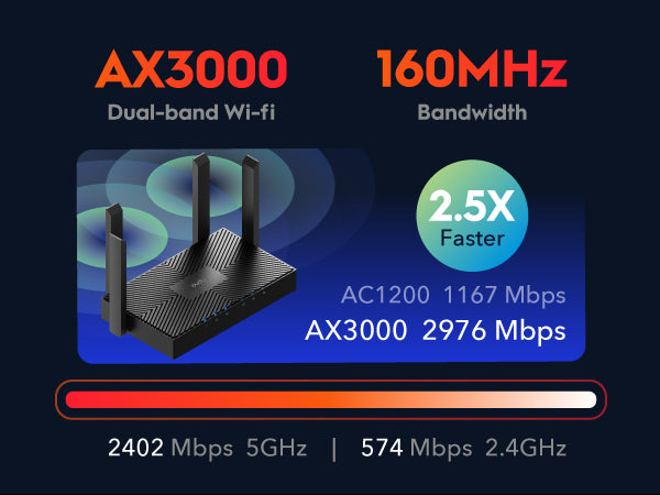- Băng tần kép 2,4GHz đạt 574Mbps và 5GHz đạt 2402Mbps.