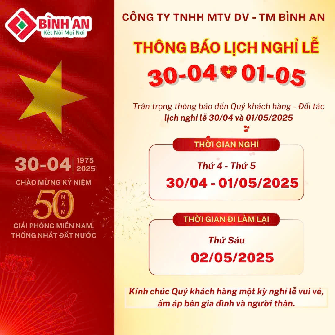 Công ty TNHH MTV Dịch Vụ – Thương Mại Bình An xin trân trọng thông báo đến quý Đối Tác và Quý Khách Hàng Lịch Nghỉ Lễ 30/04 & 01/05/2025 của chúng tôi như sau: